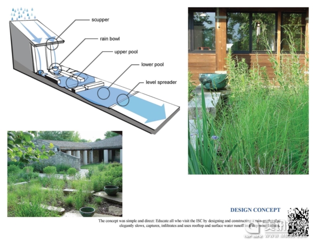 設計概念簡單且直接:通過設計和建造一個雨花園,向所有來ISC的參觀者以分段的方式展示花園減緩、收集、過濾和使用屋頂和表面流動的雨水。