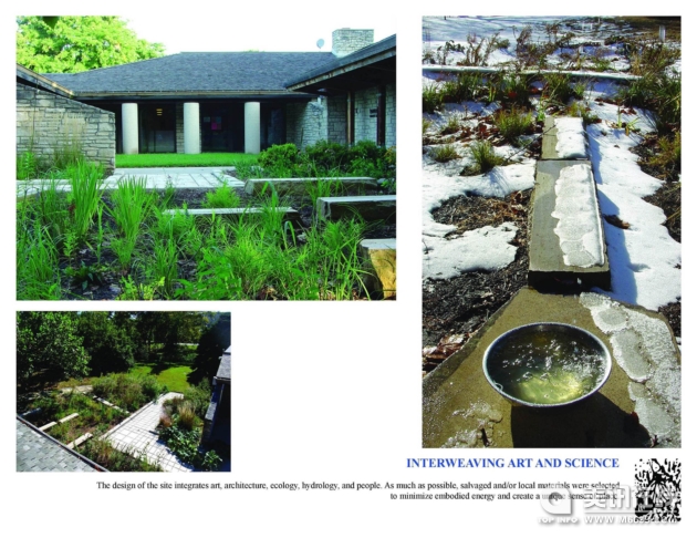 這一地點的設計結合了藝術、建筑、生態、水文和人文科學。當地材料的選用最小化了蘊藏能量并創造了一個獨特的地點。
