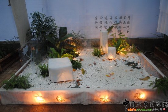 通過中國水墨畫提煉設(shè)計(jì)要素,以白沙、水面、墻體為畫紙,紗布圍制的燈柱作為構(gòu)圖焦點(diǎn),運(yùn)用燈光投射在植物上產(chǎn)生的影子顯像,展現(xiàn)中國水墨畫基本效果。選擇色濃綠的植物,突顯水墨畫沉穩(wěn)深遠(yuǎn)的意境,池中靜靜游弋的錦鯉為這幅立體水墨增添活色。