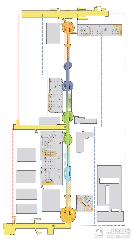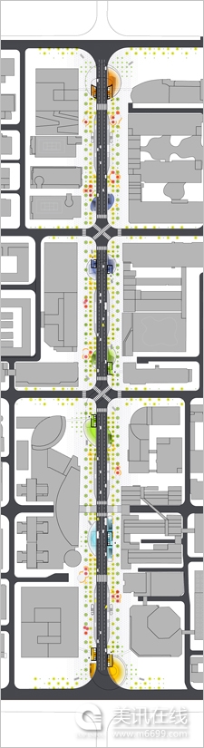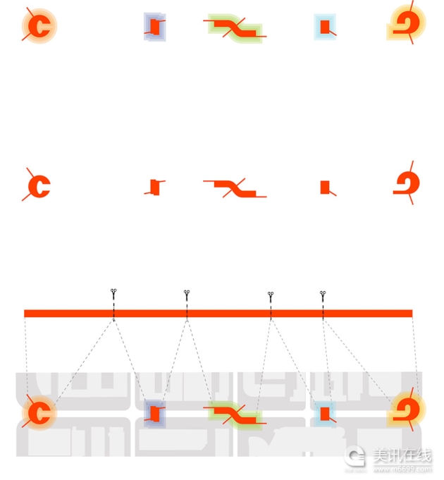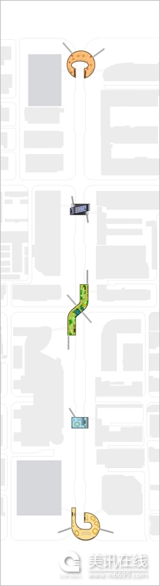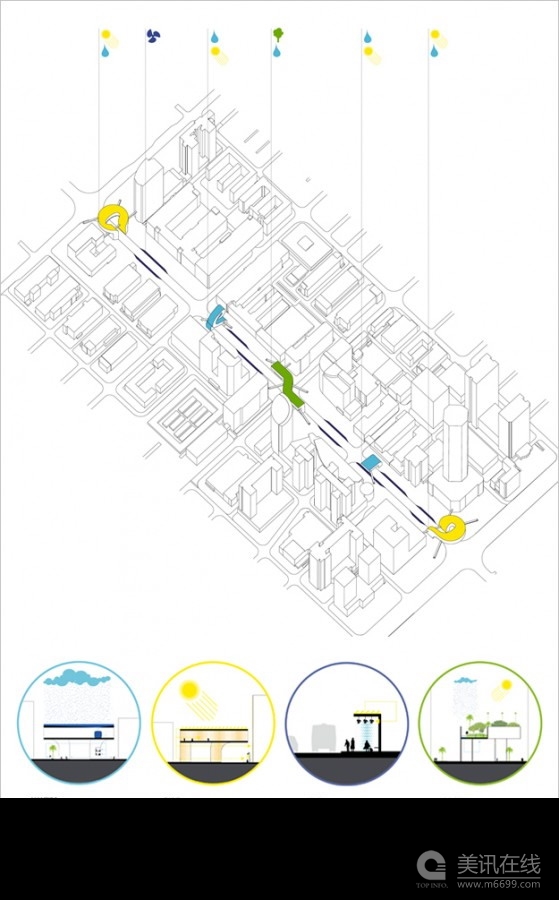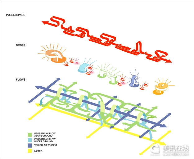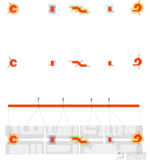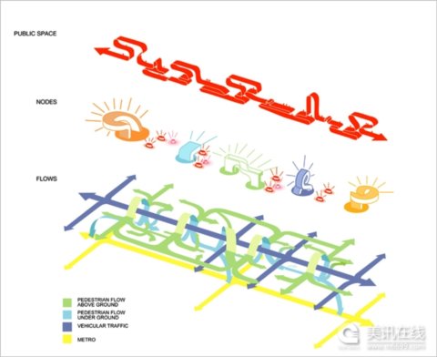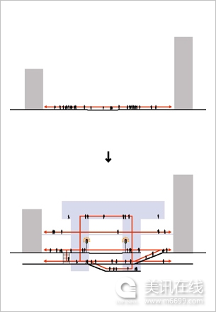 WORKac建筑事務所方案將五個過街節點放大夸張成五個燈籠型的標志建筑跨騎在道路中間。設計師說。“我們做方案時并不刻意強調視覺美學,而是游離于形式之外,反而重視空間對生活的影響,關注兩者之間的關系。建筑就像機器,既可以容納、也可以制造人的生活。以平民化的視角去關注生活、關注社會運作以及建筑能為社會生活提供什么樣的空間形式,反對英雄主義或者尖叫的建筑,這是我們一貫的價值觀!