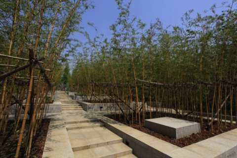 蘇州古典園林的步移景異的空間藝術(shù)效果,使得人們?cè)诶锩嫘凶邥r(shí)能夠有豐富的空間體驗(yàn)。在畝中山水園的營建過程中,主要利用了廊架、植物和假山石塊等造園要素進(jìn)行了合理巧妙的布局,營造出了步移景異的空間變幻效果,結(jié)合現(xiàn)代施工材料,簡(jiǎn)化、提煉出富有現(xiàn)代氣息的景觀空間。墻體是空間劃分最常用的設(shè)計(jì)手法。借鑒蘇州古典園林中的景墻設(shè)計(jì)手法,利用借景、透景、漏景等不同的造園方式,在不同“畝園”相連接處設(shè)計(jì)了不同形式的景觀墻體,來形成“畝園”之間的相互滲透和聯(lián)系。廊道是另外一種很好的劃分空間手段,由于廊道的庇蔭、遮擋的作用,可以為人們提供休閑的過渡通道,讓人們?cè)诓恢挥X間欣賞到不同主題“畝園”的景觀。在傳統(tǒng)的江南園林營造中,子是很重要的造園要素,古代就有“竹林七賢”的佳話。在不同的“畝園”相鄰邊界處,成片的竹子林在形成江南園林意境的同時(shí),也起到很好的空間劃分作用