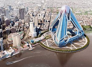 據(jù)美國媒體8日報道,美國新奧爾良市自從5年前慘遭“卡特里娜”颶風(fēng)襲擊后,重建工程迄今仍在進行中。以華裔設(shè)計師許積遜為首的建筑設(shè)計師構(gòu)思在密西西比河岸建造一座名為“新奧爾良生態(tài)建筑棲息地”的超級浮城。這座外形呈金字塔狀的“諾亞方舟”漂浮在水面上,可容納4萬人居住,外立面采用太陽能發(fā)電板覆蓋,可以利用風(fēng)力和太陽能發(fā)電,能夠抵御超級颶風(fēng),即使世界末日來臨,也可以安然無恙。