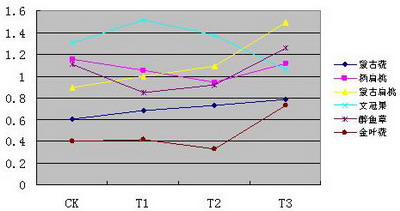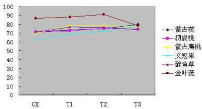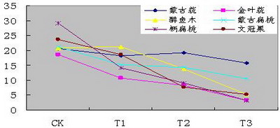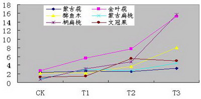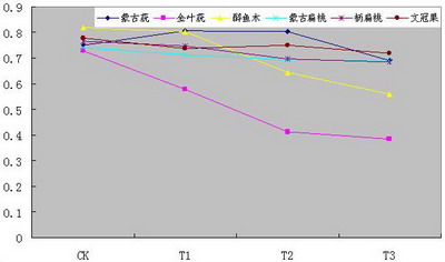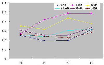 金葉蕕的Chl a/b比值增加幅度最小,文冠果的Chl a/b的比值變化最大。