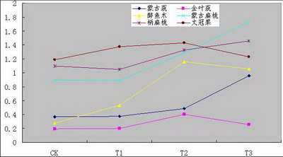 蒙古蕕和醉魚木的POD活性最高,柄扁桃和蒙古扁桃POD活性最小,文冠果和金葉蕕POD活性居于兩者之間;