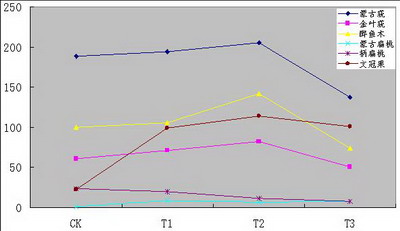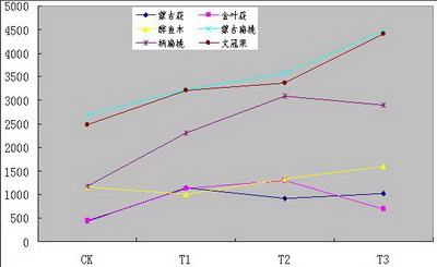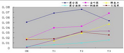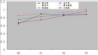 醉魚木和金葉蕕的電導率變化幅度最小,文冠果和蒙古蕕的電導率變化幅度最大。