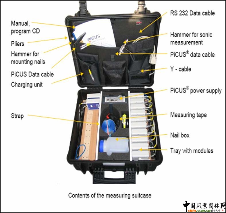 PICUS由一系列探測(cè)器組成(8到12個(gè))。它們由皮帶固定在樹(shù)干上。聲音探測(cè)器將單獨(dú)通過(guò)鋼釘與樹(shù)木建立聯(lián)系,鋼釘應(yīng)穿透樹(shù)皮并固定在樹(shù)木的第一年輪處。這樣不會(huì)對(duì)樹(shù)木造成明顯的傷害。在測(cè)量過(guò)程中,通過(guò)每個(gè)測(cè)量點(diǎn)人工產(chǎn)生聲音訊號(hào),其它探頭感應(yīng)并記錄聲音在樹(shù)木中的傳播時(shí)間。使用幾何數(shù)據(jù)我們可以確定聲音在各個(gè)測(cè)量點(diǎn)之間的傳播速度。這些速率數(shù)據(jù)將被按照一定的標(biāo)準(zhǔn)進(jìn)行互相比對(duì)。通過(guò)整合每次測(cè)量所得傳播速度,我們可以得到整個(gè)樹(shù)木橫截面的聲音傳導(dǎo)特性。之后,PICUS的分析程序?qū)?shù)干橫截面不同的聲導(dǎo)特性以不同的顏色表示出來(lái),即深色(深色以及棕色)代表高聲導(dǎo)速區(qū)域--即健康木質(zhì)部。其它顏色(紫色、藍(lán)色至淺藍(lán)色)代表低聲導(dǎo)速率區(qū)域--即受損木質(zhì)部或者空氣。