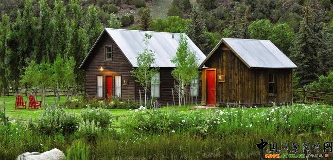 Landscape architect Richard Shaw honored the heritage of the American West with a farmstead-style garden of lupines, daisies, and other era-appropriate perennials surrounding these historic outbuildings. Groves of cottonwoods, conifers, and Lombardy poplars, long used by pioneers for demarcating property lines, offer the family compound shelter from the highway and from fierce mountain winds. 景觀設計師理查德采用農場式園林設計,用羽扁豆,雛菊以及常青植物圍繞這些美國西部遺產的歷史建筑。歷來被用來土地分界的大葉楊,針葉樹以及意大利白楊小樹林為住宅提供一個全方位掩體,使其不受高速公路和刺骨山風的影響。