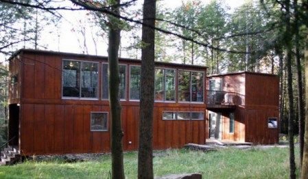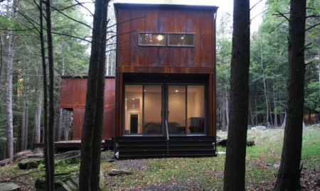 Johnson Creekwee House別墅是Alchemy建筑師已完成的預制項目,位于美國賓夕法尼亞州的Honesdale地區。別墅由一個較大可容納大多數人的日常活動空間和一個可提供睡覺的小的空間組成,其兩端由一個露臺橋梁提供連接連接。同時主要空間提供的是一個幾乎完全沉浸到壯觀和繁茂的景觀位置。