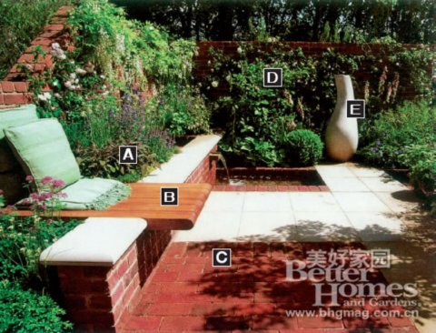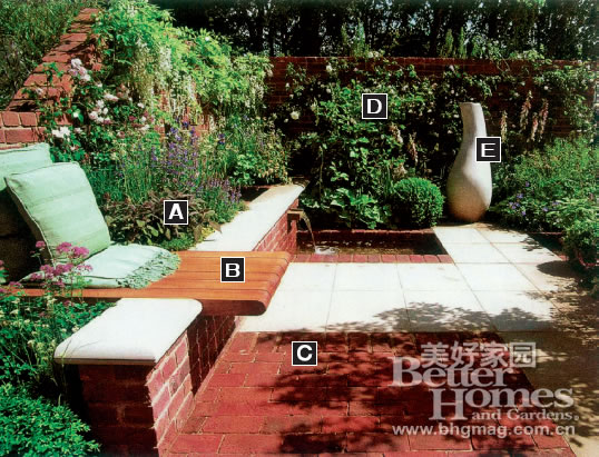 每一個庭院也許都不是完美的,但它們一定都有精彩之處。向大家介紹這六個曾在英國切爾西園藝展獲獎的庭院,想必能幫助你在設計自家庭院的時候靈思泉涌。 ![]() 1.小面積庭院,制造焦點景觀 這是設計師亞當·弗洛斯特設計的一個具有現代風格的小型庭院。在局促的面積限制下,弗洛斯特將庭院的結構規劃得十分完整,庭院所具有的景觀欣賞和休閑娛樂的功能也一樣不少。 為了增添戶外庭院的情調,弗洛斯特有意在座椅旁邊點綴了幾叢造型簡單的薰衣草。讓整個人空間看起來簡潔規整,同時,很好地體現了設計的創意與功能性。 A.長青植物、矮叢灌木和草坪這三種不同高度的園藝主體在庭院中分布得錯落有致,同時形成了自然的結構規劃,既在整體上和諧一致,分開來看也能自成一體。弗洛斯特精心挑選了白芷、戟型花、薰衣草和莢蓮作為裝飾花卉,間雜在綠色的主體植物叢中。 B.設計師在花壇上插入了一座舒適的木質長椅,讓主人可以在花叢中閑適地休息,做到了真正意義上的親近自然。 C.純手工打造的紅色約克磚砌成了一道矮矮的花墻,略顯粗糙的表面也和旁邊光滑的水池磚面形成了一種有趣的對比。 D.弗洛斯特在花墻的內部設計了一條不銹鋼的格架系統,讓庭院中攀緣的柴藤和玫瑰有所依附。 E.弗洛斯特在庭院中擺放了一座皮埃爾·拜杜的石雕作品。雖然它的位置不在庭院的正中央,但它卻很自然地成為了人們視覺上的焦點。