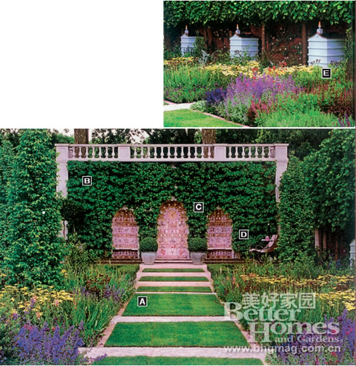 ![]() 5.優(yōu)雅繁花,典型老英國范兒 設(shè)計(jì)師羅伯特·梅耶的作品最具有典型的英國風(fēng)格。這是一個(gè)為英國老牌百貨商店Fortnum&Mason準(zhǔn)備的庭院美化方案,充分展現(xiàn)了梅耶所想要表達(dá)的古典優(yōu)雅氣質(zhì),并且非常適用于裝飾空間有限的小廣場(chǎng)。在寸土寸金的倫敦,這一點(diǎn)顯然也具有重要意義。 A.廣場(chǎng)中央規(guī)整的對(duì)稱設(shè)計(jì)使草坪看起來像一塊塊聯(lián)結(jié)好的臺(tái)階,一步步將你引向設(shè)計(jì)師準(zhǔn)備好的花叢中觀賞美景。 B.在庭院的盡頭、楓香樹挺拔傲立,仿佛自然設(shè)施的圍墻。兩旁的石坊用欄桿聯(lián)結(jié),更增添了庭院中的古典風(fēng)情。 C.石坊下有三個(gè)用貝殼和鵝卵石壘成的員工門,凸顯了舊日英國引人入勝的田園風(fēng)情。三個(gè)圓拱門在密密麻麻的綠色攀緣植物的掩蓋下,平添了幾許神秘的味道。梅耶在設(shè)計(jì)這三道拱門時(shí),只賦予了它們裝飾作用,而沒有讓它們承擔(dān)真正的聯(lián)通功能。 D.花徑兩旁的石灰?guī)r臺(tái)階為游賞的人們提供了充足的休息場(chǎng)所。庭院中的水池和噴泉周圍有黃楊木環(huán)繞,草坪蜿蜒通向可供休息的石階。 E.滿目的繁花將這片庭院打造成了蜜蜂們的樂園。靈動(dòng)的精靈在花徑間穿梭往返,為庭院增加了幾許生氣。多種植物在這個(gè)小型生態(tài)互動(dòng)空間中形成了一個(gè)自然健康的循環(huán)體系。