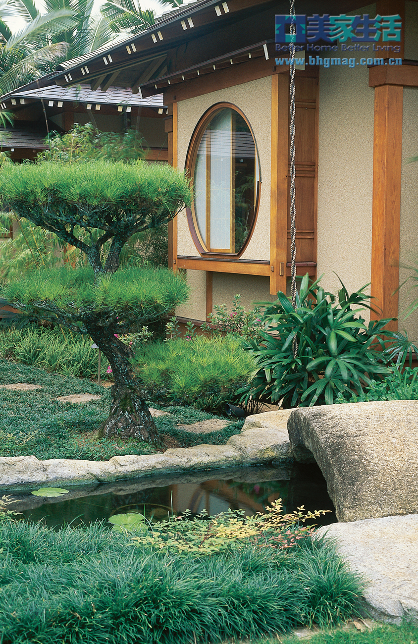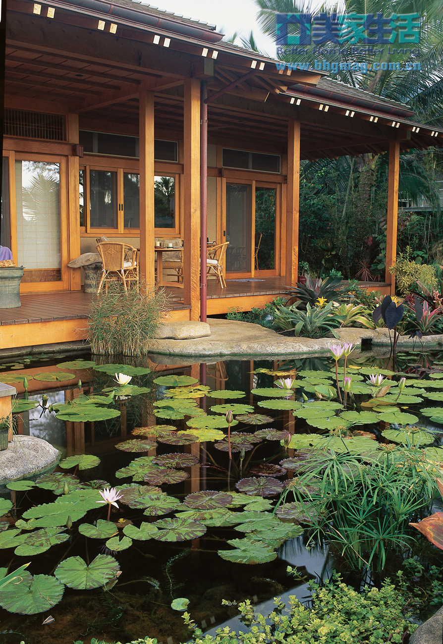 如果你曾經(jīng)參觀過熱帶島嶼,你就會明白為什么說這里的設(shè)計(jì)靈感來源于熱帶,流水、棕櫚樹和徐徐的海風(fēng)都是熱帶島嶼的顯著標(biāo)志。而石板橋、燈籠、竹子又充滿了東方情調(diào)。清透的池水寧靜自然,池塘不遠(yuǎn)處就是屋門、走廊和小徑,整個(gè)感覺就像是私人度假村。 仔細(xì)的規(guī)劃 這個(gè)水景庭院深45-75厘米,一個(gè)典型的夏威夷深度,即使是寒冷的天氣,這樣的水深都不會影響到水中的魚兒。 東方夏威夷的混搭風(fēng)情 庭院中的植物和裝飾混合了東方和夏威夷兩種風(fēng)格。典型的日式庭院多以靜觀為主,特別是小園林。東方風(fēng)格的靈感設(shè)計(jì)元素有小石橋、日式燈籠和水池,這里還混合了海桐花、鳥巢鳳梨、蘇鐵等其它熱帶植物,比如朱焦等帶有夏威夷風(fēng)情的植物就環(huán)繞在棕櫚樹周圍。 日式的安寧 院子里種著許多蕨類植物和棕櫚樹,還有彩葉草、紫茉莉、美人蕉和木瓜樹等美麗的植物。為了營造出寧靜簡約的日式風(fēng)情,不管是植物還是裝飾都選擇了接近自然的顏色,達(dá)到渾然天成的效果。一簇簇的紅色姜花和金黃色斑紋葉子的變?nèi)~木,鮮艷的色彩為院中的大面積綠色增添了嫵媚的風(fēng)情。 青蔥的常綠植物、嬌美的熱帶花朵和平靜的池水讓這個(gè)私人庭院更顯靜謐。面對如此美麗的景色,主人滿意地說:“這里就是我的私人天堂!”