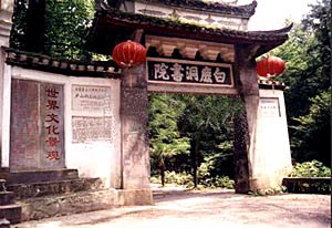 白鹿洞書院在唐代(公元618—907年)時原為李渤兄弟隱居讀書處。根據文獻記載,“渤養白鹿自娛,人稱白鹿先生”。后來李渤任江州刺史,舊地重游,于此修樓建亭,引泉植花,遂成為一處游覽勝地,取名白鹿洞。五代南唐升元年間,在此建立了“廬山國學”;宋(公元960—1127年)初擴建為書院,并正式定名為“白鹿洞書院”。白鹿洞書院是中國歷史上第一所完備的書院,與岳麓、雎陽、石鼓并稱“天下四大書院”。北宋末年,書院毀于兵火,南宋淳熙六年(公元1179年),朱熹出任南康太守,重建院內的建筑,延請名師,充實圖書,親臨講學,并奏請賜額及御書,于是書院的名聲大振,宋時著名的哲學家陸九淵、王守仁等都曾在此講學。后代書院又幾經興廢,現存建筑多是清道光年間修建的。