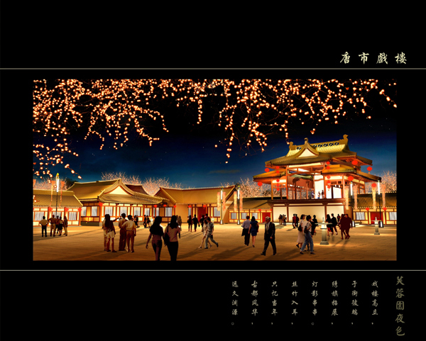 中軸區:以全園標志性景觀建筑紫云樓南北向軸線為主軸,自南而北設置南門、九重天演藝區、山水組景、紫云樓南院機動演示區、紫云樓內唐樂舞演出廳及唐代文化展廳和動感電影等現代手段之歷史文化演示區、紫云樓北水幕電影及其他傳統水上活動觀覽區。