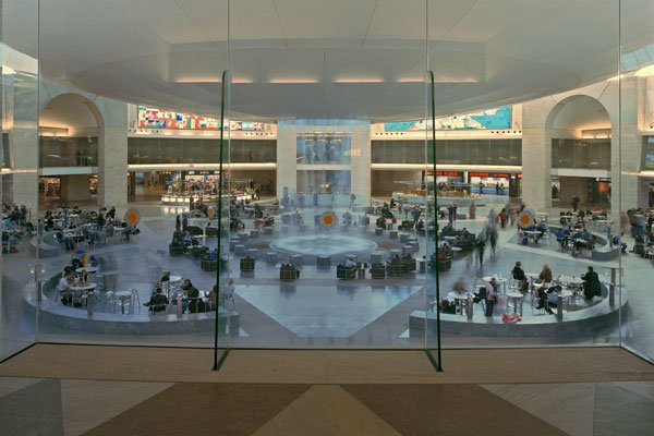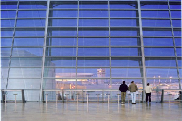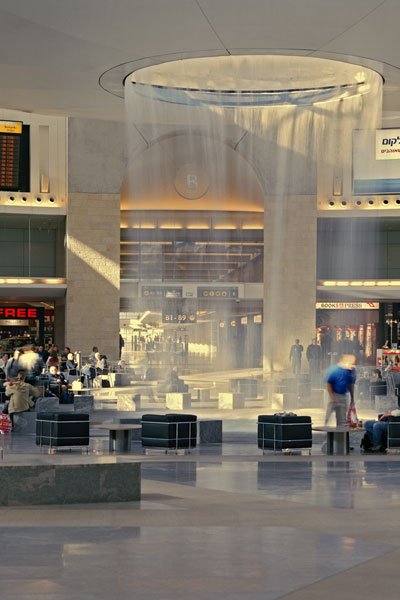 ![]() ![]() ![]() ![]() ![]() ![]() ![]() ![]() 在敵意環伺的國家中,要興建一座徹底安全的機場幾乎是不可能,位于以色列的班固利恩國際機場的建造從一開始就是個傳奇。為取代自1930年代英國托管巴勒斯坦時期早已過時不堪使用的第一航廈,第三航廈肩負以色列國際空中交通的重責大任。本計劃始于1998年,正處于巴勒斯坦人在加沙地帶和約旦河西岸的嚴重暴動時期,因此這個工程的提出象征著希望與未來。這項欲興建每年1,600萬人次載客量的航站計劃規模相當大,因此以色列機場管理局決議應當委托兩個設計團隊來擔綱機場的規劃工作。故SOM事務所紐約辦公室與耶路撒冷建筑師Karmi負責整體規劃與概念設計,并執行地面區票務系統與入境服務等系統的建立。生于以色列的建筑師Moshe Safdie位于美國麻州的事務所與TRA負責設計連結區、空中離境區與入口區。擴建后的機場集旅客輸送、物流發配、休閑娛樂與購物為一體。機場出入境候機大樓建筑面積27萬平方米,包括3個主營業區、24個登機口、133個登機柜臺、84個出入信道、10處安檢中心及面積達1.4萬平方公尺的2個購物區與免稅店,另建有停車位2500個。經過三年的設計階段,這兩組團隊費時數月做最后的協調與整合工作。SOM與Safdie均不希望航廈流于一般國際機場的形式,至少要反應出當地的文化與氣候特色。SOM負責的設計師Roger Duffy希望第三航廈能體現以色列人的生活觀,一個被古老歷史文化包圍的現代化都市。由于這座機場所安排的安檢程序特別嚴格,因此Safdie的設計團隊欲創造舒緩且親近的空間氣氛,以舒緩旅客因長久等候所造成的精神壓力。以色列對旅客與猶太人而言,可說是實質上或精神上的家鄉,因此機場管理局與建筑師特別強調機場出境與離境的動線安排,試圖體現以色列人在歷史演進中的命運。