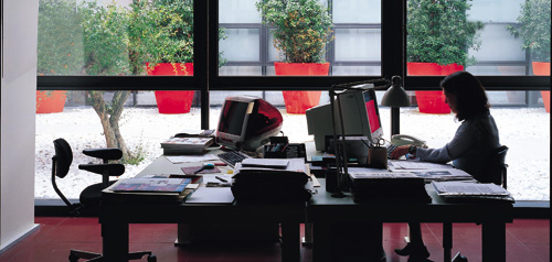 辦公室也位于廠房的一樓,它們分布在大廳的左側和右側,不同的編輯部位于不同的開放空間中,環繞在中央的院子周圍。墻壁和結構的不同形狀使空間趣味性十足,充滿個性色彩并十分舒適。 樓上是管理人員的辦公室,與開放的空間相反,它們是彼此分隔的。在這里,與眾不同的元素是拱形的天花板,與原有的建筑結構相一致,天花板上有著縱橫的梁柱,之間使用玻璃作為分隔。 最頂層是總裁辦公室,它附帶一個大面積的露臺,還有一個裝飾有Benedetta Mori Ubaldini雕塑的大會議室。在這里,拱形的天花板也得以保留,玻璃的外立面令之增色不少,也更好地利用了內部空間。這里,地板使用的也是深棕的櫟木 木板,而在露天環境下則選用了明亮的暖色調。由此,空間表現出的不同特點,由木材和色彩自身包含的各種含義所注釋。 通過結構的安排、材質的選擇并結合創新的解決方案,斯比克建筑設計合伙人事務所(Cibic&Partners)實現了最初的目標:在公共區域引發強烈的情感,而在辦公室內創造出一種溫暖且不過分傳統的工作環境。