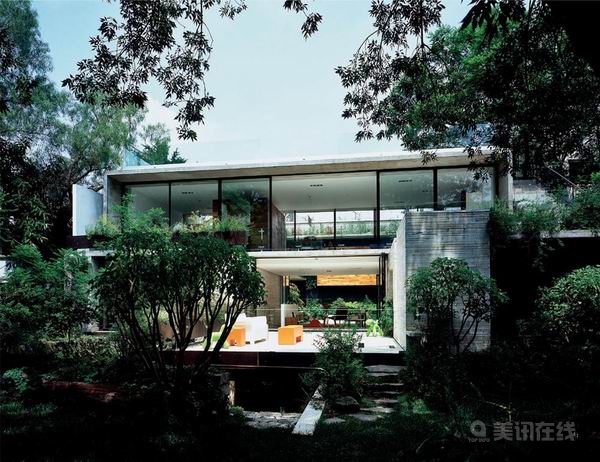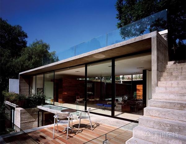Amatepec橋樓室計劃將建于墨西哥市的一處居民區,其基本設計方案是將一個簡單的開方式混凝土“盒子”置于兩塊豎直放置的大石頭上。這三種基本元素構成了一個“H”形,而這個水平的“混凝土盒子”即Amatepec橋樓室便可作為通行橋。同時H形的結構還創造了兩個院子:一個被停車場包圍著,而另外一個則開口面向花園。兩個院子靠“家庭活動室”進行連接,使得玻璃窗既可以與外界保持聯系,又可以隨時斷開聯系。 要想進入這所房子必須要經過一個橫跨于第一個院子之上10米的混凝土通行橋,這也算是房子的一部分了,包括客廳、餐廳以及廚房。這個混凝土盒子在比較長的一面墻上,通過后施壓的方法打開了一個長16米的開口。而如果要進入更為私密的區域――石頭平臺,則必須要沿著一個木樓梯走下來,這個石頭平臺起著“家庭活動室”的作用,位于混凝土盒子的正下方,在地下一層處還設有一個圖書館。