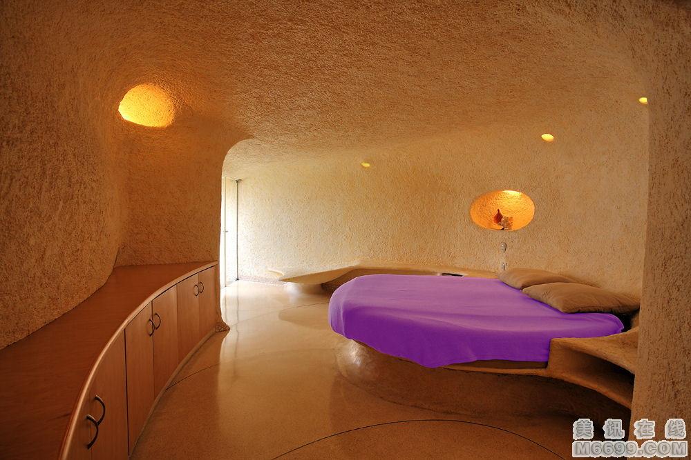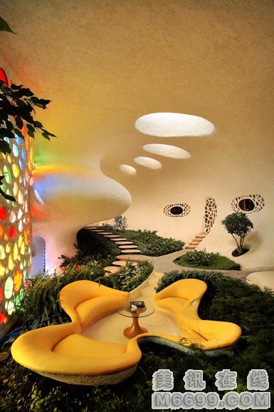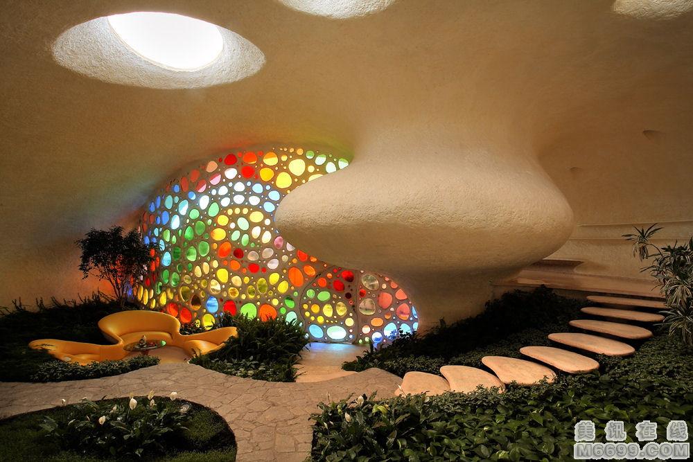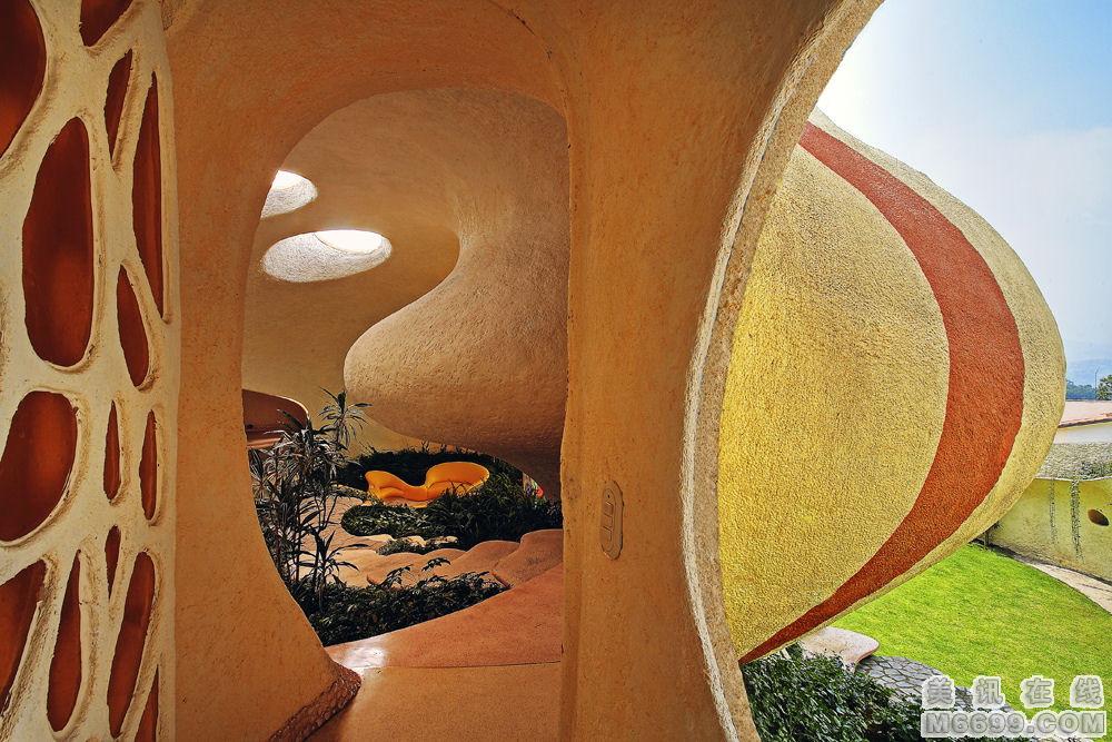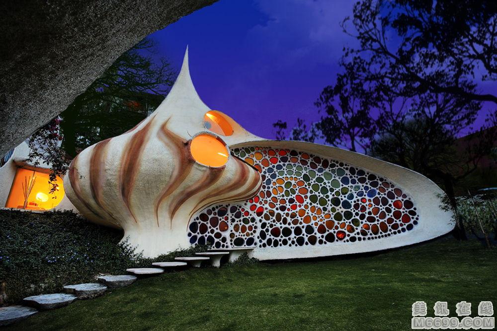 這座“鸚鵡螺”式的房屋位于墨西哥的Naucalpan,客戶是一對有兩個孩子的年輕夫婦。他們厭倦了傳統的住宅,希望能夠擁有一座融入大自然的住房.房子所在處的地勢向上,南邊、北邊和東邊都是高樓大廈,西邊則可以一覽廣闊的群山。經過無數次修改后,形成了一個鸚鵡螺式的結構。居住在其中似乎像蝸牛一樣,從一個房間緩慢移動到另一個房間,頗似共生的化石住所。住宅中沒有任何劃分,在三維的和諧空間中你會發現第四維的動感,從樓梯盤旋而下的時候感覺就像軟體動物趴在植被上。