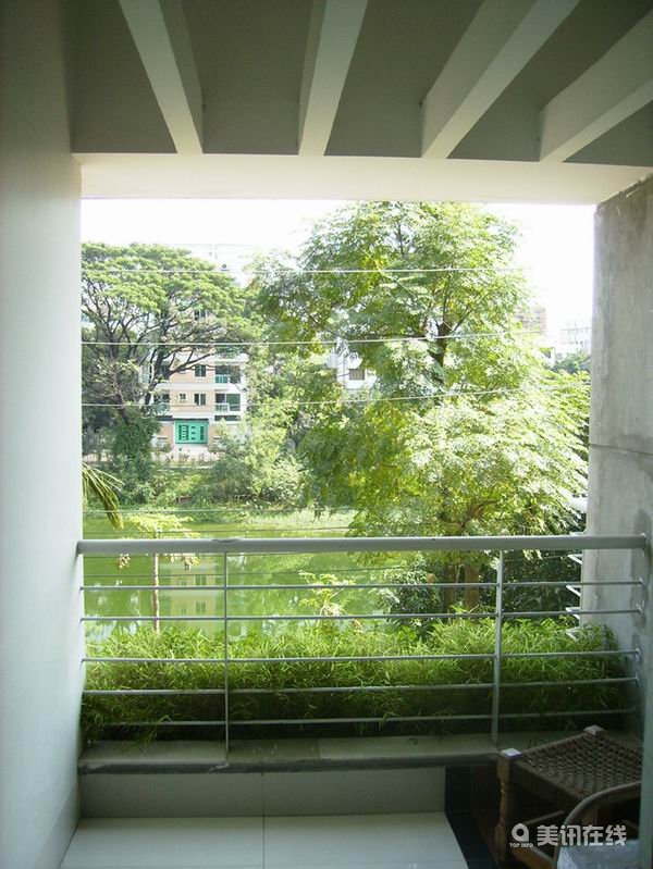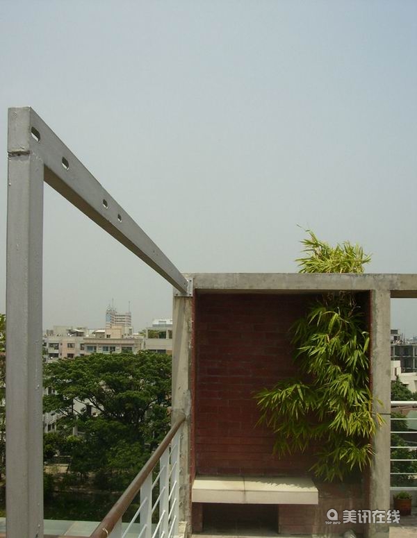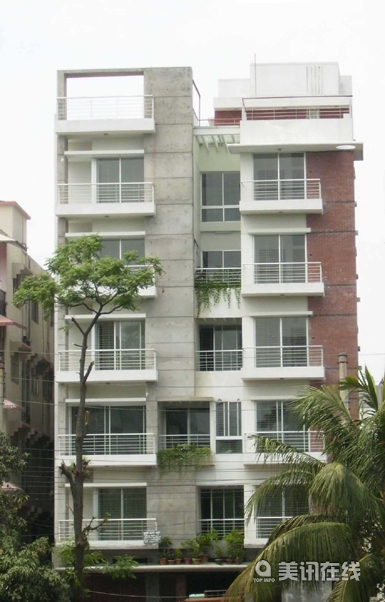 該多功能住宅位于孟加拉達卡市的一個人口密集區,被周圍的建筑物包圍著,只在前面朝向東邊的一條小湖,這也是建筑師Oli Mahmud設計這個住宅的主旨所在。除了第二層是獨戶住宅外,其他各樓層都有兩套公寓,而停車場和其他服務設施位于地面上。起居室的布局突出了自然光的作用,而且風也可以直接從外部進入室內空間。傳統的懸掛式陽臺位于前面,在這里可以欣賞到無限的美麗湖景,并且還可降低室內空氣溫度。功能布局的嚴格界線在不同自然因素的干擾下也變得模糊了。在最頂層還設計了一個小型的雙層空中花園,地面上鋪著草皮,與前面的小湖與周圍環境之間形成了一種強烈的交流與對話。 外部的觀景設施和植物像是內部空間的延展,將建筑與環境凝結在一起?罩谢▓@也減少了樓下座椅處的太陽光照。同時,該住宅還配備了一些休閑設施供居民使用。這些設施選材非常精細,全部為當地材料,簡單的設計與建筑技術的結合就構成了該生態住宅——Amin's Residence。