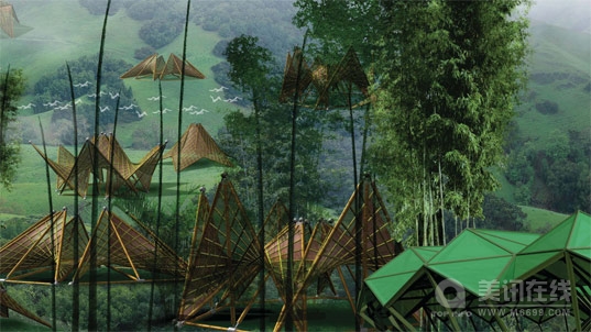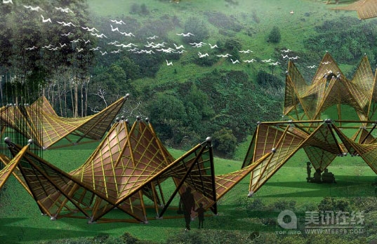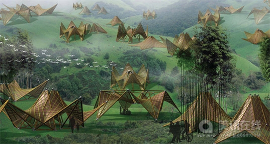 這些由中國臺灣著名竹雕工藝師陳銘堂設計的由折紙激發靈感而得的可折疊竹屋可作為震后的臨時住所。這些幾何形狀的竹屋設計的非常簡潔,全部選用可回收材料制作,并且可按照其結構紋理以多種方式折疊起來。 受2008年5月份中國四川汶川特大毀滅性大地震的觸動,陳銘堂先生設計了這些可折疊竹屋。當其得知中國政府計劃修建150萬個臨時住所的消息后,他決定要設計一些易生產、成本低并且環保的臨時房。他所設計的幾何形狀折疊屋不僅美觀,而且可以依據地形特點進行調節。 其可折疊性主要由于竹竿可以預先安裝為一牢固的幾何形狀。這些幾何形狀使得結構呈現統一性,工廠可直接快速地將一些輕便的模塊組裝起來并運往目的地。當將其組裝好后,只需將一些招貼或者紙張貼上去即可。