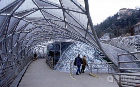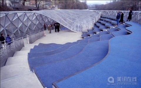水上劇場是個多功能平臺,像一艘船被錨定在河中,里頭有露天劇場、咖啡吧和兒童游戲場,兩端有步行橋和河岸相連。外觀像貝殼的水上劇場,是由兩個碗狀的鋼網構造,一個朝上一個朝下組構而成。朝上的是露天劇場,弧形的階梯看臺,沒有表演時就成了三兩好友聊天聚會的場所。朝下的是咖啡吧,藍色的玻璃圓頂,座椅緊鄰著水邊排列,夜晚,在燈光的營造下,咖啡吧頓時變成了氣氛迷離的酒吧。劇場和咖啡吧之間,也就是正反兩碗的銜接處,是由斜坡所組成,像是迷宮一樣的過渡空間,里頭有攀登、爬行和滑行等多種設施,供兒童嘻戲與冒險;斜坡底下是廁所、吧臺、廚房等服務性空間。 ![]() ![]()