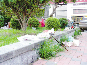 記者在現場看到,從衛津路穿過綠化帶通往書店的通道上,散落著吃剩的西瓜皮、廢塑料袋、煙頭等垃圾,許多蚊蠅在雜物上“翩翩起舞”,路過此處的市民紛紛掩鼻而行。周圍商家工作人員告訴記者,這種情況已有半個多月時間了,一直沒人清理。