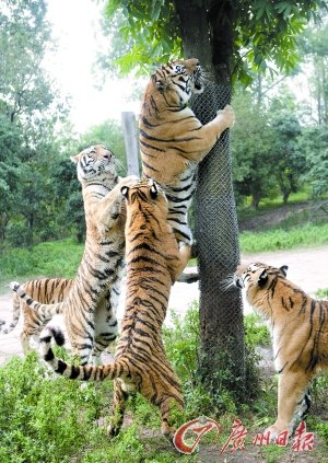 深圳野生動(dòng)物園的5只老虎登高表演。(《深圳商報(bào)》供圖)