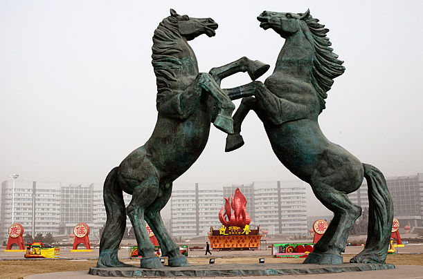 康巴什的林蔭路廣場,兩匹馬的巨型雕塑后面,一位行人走過。