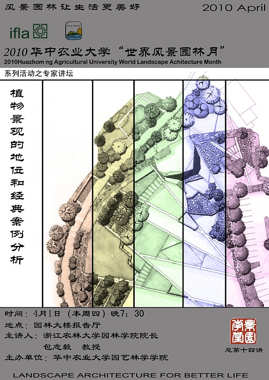 中國風景園林網(wǎng) 自2007年初,國際風景園林師聯(lián)合會(International Federation of Landscape Architects, 簡稱IFLA)宣布將每年4月確定為“世界風景園林月(World Landscape Architecture Month)”以來,華中農(nóng)業(yè)大學積極響應號召,已經(jīng)舉辦了兩屆華中農(nóng)業(yè)大學“世界風景園林月”系列活動。2010年4月,華中農(nóng)業(yè)大學的“世界風景園林月”在老師同學們的期待中再次登場。