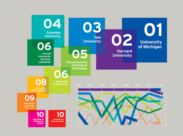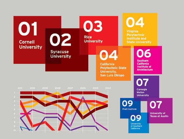 中國風景園林網(wǎng) James Cramer 和Greenway集團聯(lián)合編制的《2011美國最佳建筑設計院!烦霭,通過一系列的圖標數(shù)據(jù)分析而得出了2011美國最佳建筑與設計院校排名。