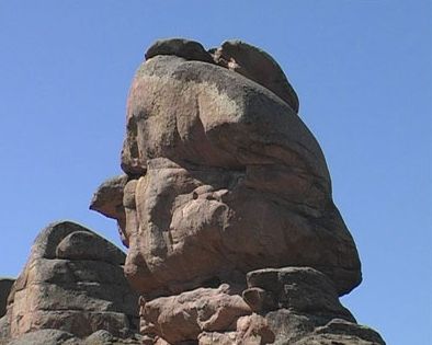 最讓人感到奇特的還屬一個(gè)巨型三維頭像,遠(yuǎn)看像是孩子們最喜愛的卡通人物奧特曼,走進(jìn)巨石,頭像又可一分為二看,左側(cè)是一個(gè)古羅馬將軍,右側(cè)是孫悟空,在驚奇的同時(shí)讓人感受到大自然的鬼斧神工。