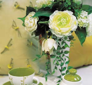 可不要把人造花想得死氣沉沉,許多常見的花材都能制作得以假亂真,不親手去摸真的分辨不出來,當(dāng)然也可以運用干燥的葉材或材,搭配得自然合宜;而在設(shè)計與插法上,不僅能與真花匹配,還因材料的可塑性,創(chuàng)造出別具創(chuàng)意的造型;想要渡過酷暑,不用擔(dān)心保存問題,選個金屬或陶石類的花器、素凈的花卉,點綴個綠葉,就擁有與自然植物相同的功能。至于清潔方面,只要1~2個星期,掃去上面的灰塵,一年的亮麗完整就不成問題,也省了定時澆水,處理枯枝敗葉的麻煩事。