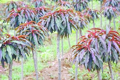 桃樹是我國北方地區園林綠化的重要樹種,桃花游已成為人們初春踏青的首選之一。而如今,這個家族又多了一位彩葉成員———紅葉壽星桃,它不僅可以賞花,其鮮亮的紅葉也十分惹眼。記者了解到,該樹種經過5年的選育、栽培和試用,即將投放市場。“這個樹種集觀葉、花、果、樹形于一身,適應性強、應用形式多樣,未來的市場前景不容小覷。”采訪中,多位業內人士如此評價。 紅葉壽星桃是壽星桃的一個變種,植株矮化、花芽密集。與普通壽星桃相比,紅葉壽星桃的葉子常年呈紫紅色、顏色鮮亮,葉片更為細長;開花繁茂、花更大,以復瓣居多,冠形飽滿,應用形式更為靈活,盆栽觀賞、低矮造型球、中高層列植做色帶等均可。 五年前,河南遂平縣玉山鎮名品花木園藝場場長王華明在苗圃中偶然發現了壽星桃的這一變種,經過擴繁,如今紅葉壽星桃在數量及規格上已初具規模。說起這一樹種,王華明列舉了它的三個優勢。 首先,紅葉壽星桃觀賞性強,紅葉期長。在整個生長季節內,其葉片均呈亮紫紅色,葉片稠密,株形緊湊,整株色感表現極好。 其次,適應性強,既耐高溫、又耐寒冷。紅葉壽星桃在冬季不低于-23℃就不會發生凍害。喜干燥環境、喜光,耐旱性極強,適宜于排水良好的壤土中生長,也稍耐鹽堿和黏重土壤,但不耐水澇。 再次,嫁接成活率高、成型快。紅葉壽星桃的繁殖以嫁接為主。嫁接多用切接或盾形芽接,春夏秋三季均可嫁接。砧木可用毛桃,亦可用李、杏、梅等。切接在春季芽萌動時進行,芽接于8月上旬至9月上旬進行。該樹種一般不需要整形修剪也能保持良好的冠形,只要在花后注意剪除干枯死枝,適當疏枝即可。嫁接苗1至3年就能開花結果,4至8年即進入花果盛期。 由于優點突出,紅葉壽星桃還在苗圃繁育階段就被不少生產商和苗木經紀人瞄上,目前在河南、四川等地有小范圍應用,適應性和景觀表現良好。談及應用前景,王華明表示,壽星桃是桃中最適宜于盆栽的品種之一,而紅葉壽星桃更因葉色紅艷喜人,開花繁茂艷麗,在盆栽領域大有作為,可制作成中型或微型盆景。 另外,紅葉壽星桃的傘狀冠十分緊實,可以低接做成色球,亦可高接在園林造景中作為中高位色帶。“三年生低接紅葉壽星桃的冠幅能達到80厘米,整株高度在1米左右。”王華明說,目前他的苗圃里各種高接、低接的紅葉壽星桃有上萬株,今秋或者明春將正式推向市場。王華明已向國家林業局提出植物新品種保護申請。另據業內人士反映,由于該樹種目前的生產量較小,價格較高,對大范圍推廣形成一定障礙,隨著市場量增價降,其推廣應用前景樂觀。