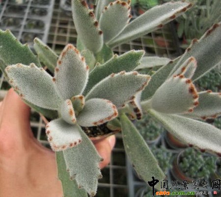 月兔耳 中國風(fēng)景園林網(wǎng)訊 月兔耳,又名褐斑伽藍(lán),為景天科伽藍(lán)菜屬多年生肉質(zhì)草本植物;莖直立,多分枝,葉生于枝上,肉質(zhì)葉片匙形,上面密被白色絨毛,下部全緣,葉緣上部有缺刻,缺刻處有深褐或棕色斑塊。褐斑伽藍(lán)植株被滿白色絨毛,肥厚的肉質(zhì)葉片形似兔子的耳朵,其葉片邊緣著生的深褐色斑紋,又酷似熊貓,故又有熊貓植物的美稱,奇持而美麗,是多肉植物中的觀葉佳品,深受人們特別是少年兒童的喜愛。常作小型盆栽,用于裝飾客廳、臥室、陽臺(tái)和窗臺(tái)等處,極富情趣。也可與其他多肉植物合栽,制作組合式盆景,效果很好。 月兔耳原產(chǎn)非洲的馬達(dá)加斯加島,喜陽光充足和溫暖、干燥的環(huán)境,耐干旱,不耐寒和水濕。夏季放在通風(fēng)涼爽處養(yǎng)護(hù),并適當(dāng)遮蔭。但過于蔭蔽,會(huì)造成莖葉柔弱,絨毛缺乏光澤,使觀賞價(jià)值降低。其它季節(jié)則要充分見光,生長季節(jié)盆土過干過濕均不利生長,容易引起基部葉片脫落,影響觀賞效果。 冬季放在陽光充足的室內(nèi),節(jié)制澆水,8~10℃即可安全越冬。每年的春季換一次盆,盆土要求中等肥力、排水良好的沙壤土,新栽的植株不宜澆水過多,否則容易腐爛。 月兔耳的繁殖可在生長季節(jié)選取莖節(jié)短、葉片肥厚的枝條作插穗進(jìn)行扦插,插穗長5~8厘米,以頂端莖節(jié)為佳,切口應(yīng)稍干燥一下,然后插于素沙土中,保持半濕,20天左右即可生根,一個(gè)月后上盆定植。也可將葉腋分蘗的小芽掰下,進(jìn)行芽插。如需大量繁殖,則可用單葉扦插,方法是在生長季節(jié)剪取生長充實(shí)的葉片,平放在沙質(zhì)土壤上,將葉柄略壓入土中,然后放在半陰處,盆土保持一定濕度,2Q~30天即可生根,并逐漸長成小植株。