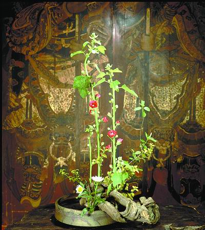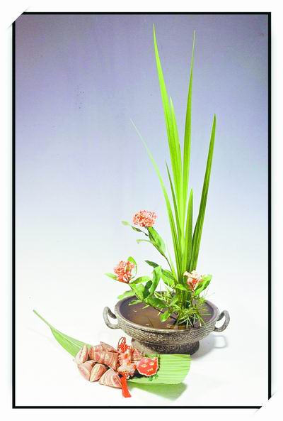 “一花一世界,一葉一乾坤”,就像品國畫一樣,欣賞中國傳統(tǒng)插花,也會讓你感受到這種詩般的意境。端午的腳步日漸臨近,作為中國傳統(tǒng)文化和藝術(shù)重要的組成部分,中國傳統(tǒng)插花又一次攜著粽葉、艾草、蒲包走進(jìn)我們的心靈…… 除了吃粽子等習(xí)俗,端午節(jié)時在家中擺上一盆“端午插花”,也會大大增添節(jié)日情趣。 來自臺灣的人文花道大師王國忠特意創(chuàng)作了幾件端午花藝作品。其花材用到了菖蒲、艾草等,配件則用到了粽子、香包。這些都是代表端午文化特色的常用素材。 古代有傳說:“五月五日午,天師騎艾虎。手執(zhí)菖蒲劍,瘟神歸地府。”可見,菖蒲和艾葉在古代被用作辟邪驅(qū)瘟。其他如香蒲、榕樹、香茅、蘭草、萱草等亦為端午節(jié)的代表花材。用于插制傳統(tǒng)插花的一般有六大容器,即籃、碗、缸、筒、盆、瓶、筒,中國傳統(tǒng)插花也因?yàn)檫@六大容器而被分為籃花、碗花、缸花、筒花、盆花、瓶花。 中國傳統(tǒng)插花給人感覺屬“大雅”之藝術(shù),但自己DIY并不難,廚房里的盤子、碗、砂鍋、砂罐等都能拿來插花,花材也能很方便獲得:到野外郊游,采幾根枝條,摘幾朵野花,回來插在瓶里,也許就是一件得意之作。如果想專業(yè)一點(diǎn),到花店或市場買一塊劍山(代替花泥固定花材的、可反復(fù)使用的工具),創(chuàng)作則可更加隨心所欲。