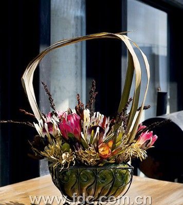 俏麗多姿的孔雀正開屏顫動,這組花藝帶給人動感的想象。 花材:帝王花、紅瑕、菲利卡、杰斯塔、星點木、跳舞蘭、八角金盤 制作:左邊以杰斯塔、紅瑕做放射式結構,右邊配合八角金盤形成不對稱放射式。中心以帝王花為焦點,點綴穿插一些星點木,右下方則點綴地插入跳舞蘭。 7)高粱之秋
