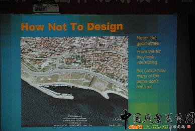 在這種場合,一般與會者都會展示許多成功作品的圖片,讓在座各位設(shè)計(jì)師振奮一下精神,但我想打破慣例,一開始談?wù)勎宜娺^的最差的風(fēng)景園林項(xiàng)目。我們從別人錯誤中學(xué)習(xí)到的和從別人成功中能學(xué)到一樣多的東西。講完這個極其失敗的項(xiàng)目之后,我想再談?wù)劺碚摚M梢哉f明這個項(xiàng)目何以失敗。然后我再向大家展示一下好的作品,讓大家恢復(fù)信心。 很遺憾,這個例子來自土耳其,而土耳其已經(jīng)成為我的第二故鄉(xiāng),自從我娶了一個土耳其姑娘為妻,我夫人也是一個風(fēng)景園林師,但她與這個項(xiàng)目一點(diǎn)關(guān)系也沒有。我向大家展示這一作品主要是想提醒大家,將園林設(shè)計(jì)看做是圖案創(chuàng)造是愚蠢的,最大的錯誤就是被平面的幾何圖形所束縛,而不考慮場地的材料和社會背景。 ![]()