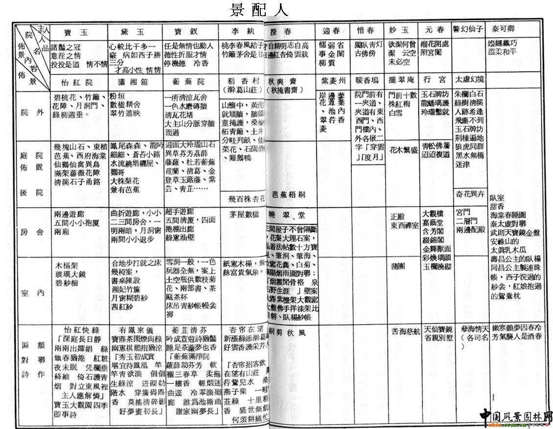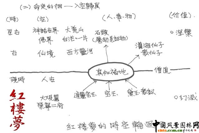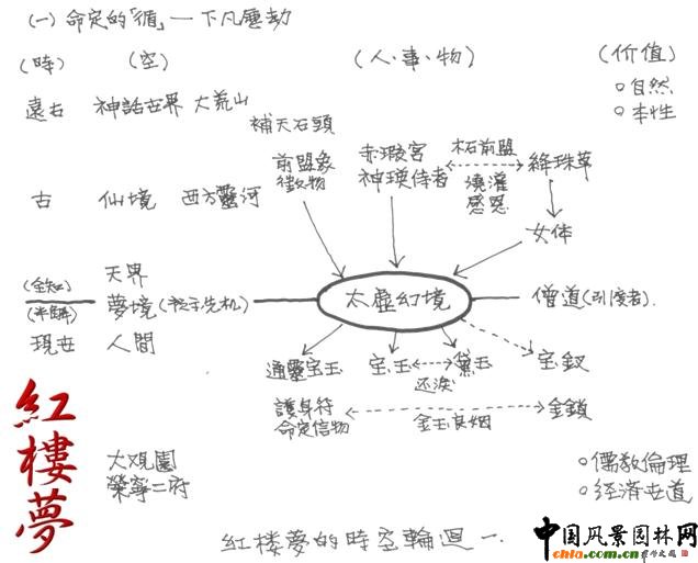 大觀園中各景區串連;“對景”應用較少,無“借景”、回廊的描述;水面主次不分;有假山;動植物;建筑品味;題對額。 ![]() 景配人(圖) 園林意念:“人間”、“仙境” 、“妖境” 、“仙鄉何處” 、“幻境” (佛道民間信仰+文人理想)。 b.由大觀園于小說之地位,論其象征意義 家族末世:起造→抄檢 創作說法: 有本說: ![]() 頤和園平面圖 ![]() 圓明園平面圖 ![]() 南京行宮圖 ![]() 紅樓夢的時空輪回--下凡歷劫 ![]() 紅樓夢的時空輪回--入空歸真 結論: 李澤厚:紅樓夢是中國封建末世文藝方面,一個出自士大夫的精彩大總結。 紅樓夢、大觀園此文筆園林的創作,是中國文化象征系統的翻新設計。 (中國文化里人生哲理儒、道、釋與小說里“真實人生”的驗證與思辯。)