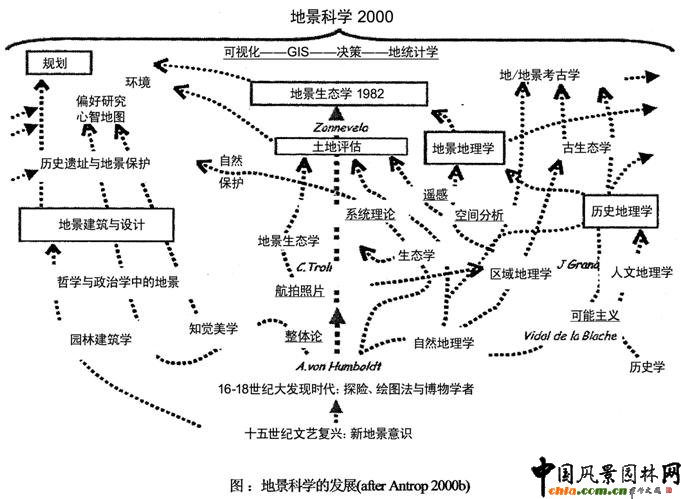 從學術與理論發展來看,建筑、地景、城市規劃學科都在展拓: ——建筑方面走向“廣義建筑學”; ——規劃方面更在走向多學科的融合,涉及科學、技術、人文、藝術等內容; ——園林學也不例外,下文將詳述。 三個學科在“展拓”的過程中,都有互相融合與變革的一面。 3.4 清華大學暖通專業的展拓 20多年來,在江億院士帶領下的清華大學暖通專業從傳統的暖通工程,該專業開始 面向人居環境、面向城市、面向建筑,從建筑物理基礎科學多方位的轉向了“節能”、“減排”的工作,這也是一種很有創造性的展拓,可以作為建筑技術科學展拓的佳例。 3.5 談園林專業的重組的幾個基本原則 3.5.1 面向人居環境 F.L.Olmsted,Ian McHarg等,無不是因時而變,因事而造,創造性的解決了人居環境問題而推動學科發展的核心問題。 麥克哈格在寫完《設計結合自然》之后即轉向關注人類生態學(Human ecology)是走向了人與環境的整體對象。 西方也曾有Human habitats: a focus for design education in the 21st century一文,文中試探性的提出了二十一世紀設計學教育應該以人居環境為對象,關注人口增長、生境的破壞、人類健康等重大問題。 以此整體做為對象是發展學科的需要。 3.5.2 以生物學為基礎 大自然是由基本的非生物體和生物體構成的,生物學是研究生命現象和生物活動規律的科學。 要對于大自然,對于種種人居環境問題有所應對,就應以此為基礎。 我國生態環境問題還表現在野生動植物物種數量銳減,各類生物物種受威脅的比例普遍在20%-40%。 僅以此例,足以說明問題的嚴峻性和它在園林中的地位。 3.5.3 以生態學為綱 西方現代文明,生態學(ecology)已經成為最為先進的學科之一,ecology的觀念在不同的領域有所發展。應作為地景學的基礎。 有論者認為,這個學科生物學和生態學的課程應該占到50%~60%,地學課程應該占到40%~50% 發展最快,收獲豐富,應用最為廣泛的是地景生態學。 景觀生態學的發展和廣泛應用可以說是地景學最為革命性的變化。 有論者認為,這個學科生物學和生態學的課程應該占到50%~60%,地學課程應該占到40%~50%。 “軟”、“硬”學科要相互融合,傳統的造園、設計為“軟”,這些傳統要和生態、技術等“硬”學科銜接,生態學明顯為“硬”,而要逐步通過文化、藝術來改造與融合,使其變“軟”,變為一般原則,為更多的人所理解和接受。 我在《廣義建筑學》中曾提過“軟的學科要變硬,硬的學科要變軟”,“感覺到的東西不一定能理解它,只有理解的東西,才能更深刻的感覺它” 。 3.5.4 以多學科整體架構 學術的發展寄托于多學科充實與融貫。 ![]() 地景科學的發展 Marc Antrop針對地景學的發展描繪了一個生動的譜系,其中可以看到多學科的交叉和交融現象。他將地景學的總體發展劃歸為三個傳統: 第一是自然科學,其中地景生態學起著主導作用; 第二是人文科學,其中多運用歷史地理、歷史生態學、人文主義和符號學的途徑; 第三是應用科學,主要是指地景設計、建筑設計與規劃領域。 在中國,專業分化比較厲害,各個專業都有自己的協會和組織,各自有各自的語言體系,不容易溝通。 但是實際上,一旦我們進行人居環境建設就會發現,我們面對的是同一塊土地,面臨相同的問題。 要對于人居環境有貢獻必須建立大的學科體系,要有大目標,有宏觀的視角,努力形成可以溝通的語言體系。 中國建立整體的跨學科的地景專業應該是孜孜以求的目標。 3.5.5 以人居環境設計方法為手段 大小不同尺度的規劃設計,綜合應用各種設計手段。 建筑、城市規劃、園林的“三位一體”三者互相交叉,互為滲透,互為補充。 不論城市規劃、區域規劃還是風景園林,其設計都是以地理為基礎的。 設計工作者要加強對宏觀地理概念的理解,也要注重對不同尺度地理環境的再認識和再發現。 這樣說不是說我們的專業要讓位于地理,而是有了更大的展拓。