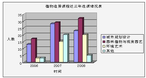 1.3環(huán)境藝術(shù)、室內(nèi)設(shè)計(jì)及與風(fēng)景園林相關(guān)的其他專業(yè) 環(huán)境藝術(shù)設(shè)計(jì)專業(yè)涉及區(qū)域景觀設(shè)計(jì)、城市生態(tài)植物研究、室外環(huán)境設(shè)計(jì)、城市廣場、小品設(shè)計(jì)等方面;室內(nèi)設(shè)計(jì)主要包括文化和物質(zhì)環(huán)境意識,室內(nèi)空間、室內(nèi)裝飾、室內(nèi)陳設(shè)、室內(nèi)環(huán)境以及對人們生理、心理影響的研究。專業(yè)內(nèi)容均與風(fēng)景園林教育有一定的交叉和融合,植物景觀的創(chuàng)造亦是其中不可缺失的重要部分,在教學(xué)中,要充分發(fā)揮風(fēng)景園林觀賞植物應(yīng)用的優(yōu)勢,將植物造景與環(huán)境藝術(shù)、室內(nèi)設(shè)計(jì)的知識體系相融合,讓學(xué)生在專業(yè)的學(xué)習(xí)中,利用掌握的植物造景知識靈活應(yīng)用于所學(xué)專業(yè),提升設(shè)計(jì)作品的科學(xué)性和藝術(shù)性。筆者通過多年的教學(xué)實(shí)踐經(jīng)驗(yàn),總結(jié)風(fēng)景園林教育中不同專業(yè)植物造景課程所需掌握的知識廣度和深度,從而直觀地剖析園林植物配置與造景課在各專業(yè)中的定位。(見表3) 植物造景作為當(dāng)今非常熱門的課程之一,受到越來越多高校和園林工作者的關(guān)注,許多院校也針對當(dāng)前的需要相繼開設(shè)了這門課程。結(jié)合南京林業(yè)大學(xué)近三年來園林植物配置與造景課選課情況進(jìn)行比較分析(見表4),不難看出,選修本課程的研究生總?cè)藬?shù)呈現(xiàn)出逐漸遞增的趨勢,園林植物與觀賞園藝專業(yè)學(xué)生占據(jù)主導(dǎo)地位,其次為城市規(guī)劃設(shè)計(jì)和環(huán)境藝術(shù)專業(yè),表明本課程正處于逐漸發(fā)展之中,并向著專業(yè)化、多元化兩個(gè)方向發(fā)展,植物造景也會以其專業(yè)化的技能和必要的知識體系,受到越來越多的重視。 表3:風(fēng)景園林教育中不同專業(yè)植物知識儲備比較分析