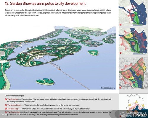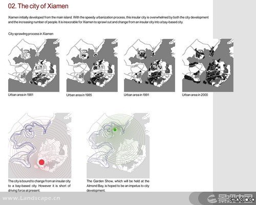 規(guī)劃方案利用本土地域特色作為切入點(diǎn),科學(xué)地解決園博會(huì)的功能和景觀問(wèn)題。通過(guò)組織新的景觀結(jié)構(gòu),與原有的地域信息形成新的結(jié)構(gòu)體系,滿足展會(huì)時(shí)和展會(huì)后的需要。并且,在設(shè)計(jì)之初,就考慮到整個(gè)規(guī)劃要與2007年中國(guó)廈門(mén)國(guó)際園林花卉博覽會(huì)的主題“海灣綠島,共有家園”相吻合,與本土地域的特征和廈門(mén)的大環(huán)境相吻合。廈門(mén)園博會(huì)會(huì)址選在廈門(mén)市杏林灣一片面積為6.76平方公里的魚(yú)塘上,這里將是未來(lái)廈門(mén)島外的城市新區(qū)。