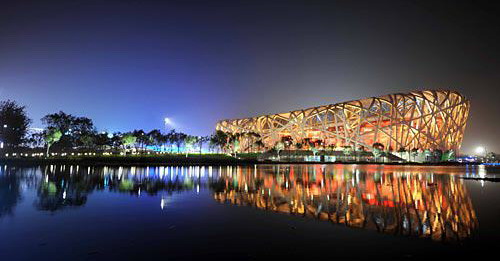 這是7月16日晚拍攝的國家體育場夜景。當(dāng)晚,北京奧運會主會場“鳥巢”夜景照明系統(tǒng)舉行竣工后的正式彩排。據(jù)介紹,鳥巢夜景照明由五個部分組成,其中主體照明以傳統(tǒng)文化元素“中國紅”為主色。鳥巢夜景照明系統(tǒng)可演示不同的動態(tài)效果場景,包括金色、銀色、紅色及紅色動態(tài)表演。