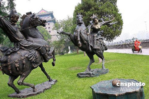8月28日,女雕塑家黃劍獻(xiàn)給2008年北京奧運(yùn)會(huì)的大型群雕《明皇貴妃馬球圖》在北京明城墻遺址公園展出,不少游客前來參觀拍攝。貴妃馬球雕塑作品是奧林匹克公園內(nèi)唯一一組與環(huán)境景觀同時(shí)設(shè)計(jì)的永久性雕塑,也是一組在中國公共藝術(shù)作品中罕見的描述古代體育運(yùn)動(dòng)的大型雕塑作品。