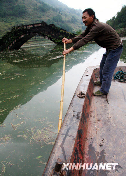11月2日,一名船工在述先橋邊用篙桿測試水深。 饒國君 攝