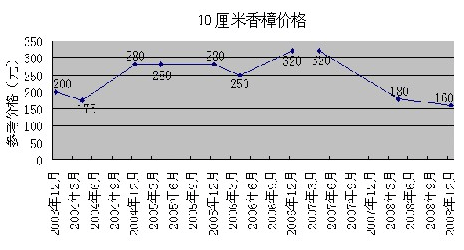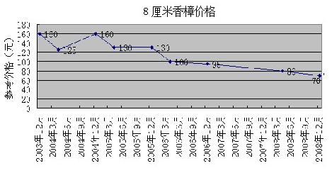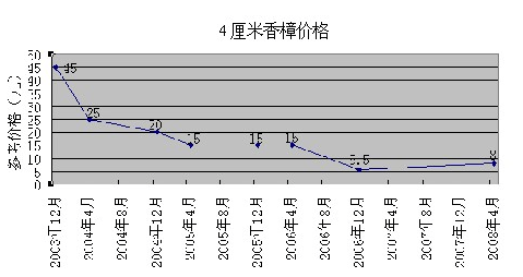 花木價(jià)格順大勢而波動(dòng),生產(chǎn)亦應(yīng)順勢而為。按照走勢生產(chǎn),可以減少出錯(cuò)。以下是4種規(guī)格的香樟從2003年12月到2008年4月的價(jià)格波動(dòng)圖表,可為業(yè)內(nèi)朋友分析花木價(jià)格走勢作參考。如果業(yè)內(nèi)朋友對此感興趣,筆者還可提供廣玉蘭、櫻花、銀杏、紅楓、樂昌含笑、杜英、茶花、桂花等多種花木的價(jià)格波動(dòng)圖表,并希望能與業(yè)內(nèi)朋友共同探討。
