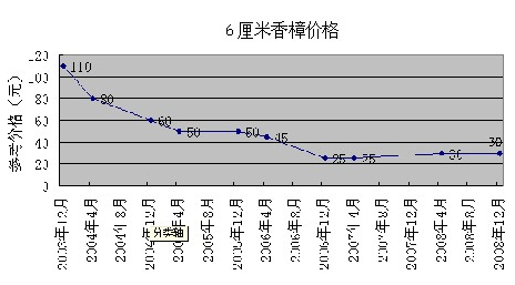 從花木周期波動(dòng)表中可以看出,從2003年開始,同種樹苗小規(guī)格苗木普遍下降曲線較為陡峭,波動(dòng)幅度較大,大規(guī)格花木波動(dòng)幅度最小。以香樟為例,胸徑10厘米的香樟2004年全年價(jià)格為280元,至2006年下半年12月開始沖高至320元,隨后2007年下半年回落至190元,并繼續(xù)呈下降趨勢,至2008年12月下降至160元;4厘米的香樟2004年就從上半年的25元下降至15元左右,之后盤整至2006年12月以5元價(jià)格探底,然后開始慢慢筑底反彈,并有上升趨勢。通過觀察發(fā)現(xiàn),曾經(jīng)創(chuàng)造輝煌的木蘭科小苗已有反彈跡象。