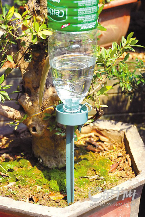 自制自動澆水裝置省錢又環(huán)保。把一大可樂瓶洗干凈,裁為兩截。瓶蓋上鉆幾個孔,用一棉線穿過小洞,擰上瓶蓋,瓶口部分倒扣在瓶身上,棉線觸及瓶底。瓶身裝水,瓶口部分種花,缺水時底下的水會自動吸上來。有心思的朋友還可為瓶包裝上漂亮的外衣,制作簡單,適合小株植物。不妨動手試試吧!