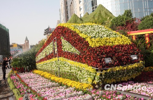 9月20日,鮮花組成列車,穿行在山川之中,寓意祖國現代化建設蒸蒸日上——“高速列車”國慶立體花壇亮相北京王府井大街,吸引游客行人拍照留念。據悉,北京長安街22處立體花壇已經擺放完成。