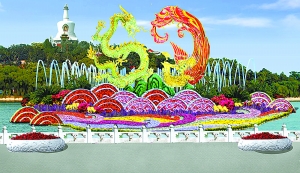 北海南門主題花壇―― 龍鳳祥和,花壇以植物材料制成的龍鳳造型作為主景,祥龍與彩鳳在太液池上飛舞組成了數(shù)字60圖案。花壇花材以花期控制的各種菊花為主要花材。