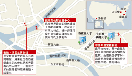 有7層展覽面積的安迪·沃霍爾博物館(AndyWarholMuseum)是全世界最大的單人藝術博物館,用來紀念在匹茲堡出生的20世紀藝術界最有名的人物之一、波普藝術(編注:抽象表現主義的藝術,20世紀50年代初萌發于英國,50年代中期鼎盛于美國。波普藝術為PopularArt的縮寫,意即流行藝術、通俗藝術,其在作品中大量運用廢棄物、商品招貼電影廣告、各種報刊圖片作拼帖組合)的倡導者和領袖安迪·沃霍爾。美國第一夫人米歇爾·奧巴馬將于9月25日中午在此設宴款待G20成員國首腦的配偶。
