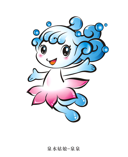 吉祥物“泉泉”采用了擬人化的手法,將泉水和荷花結(jié)合形成形象主體。吉祥物形象以泉水和水花組成女孩的頭發(fā),突出了濟(jì)南泉城的地方特點(diǎn)。荷花是濟(jì)南市的市花,以荷花的花型變化成女孩的長(zhǎng)裙,表現(xiàn)出濟(jì)南泉水和荷花相映的美麗景色。